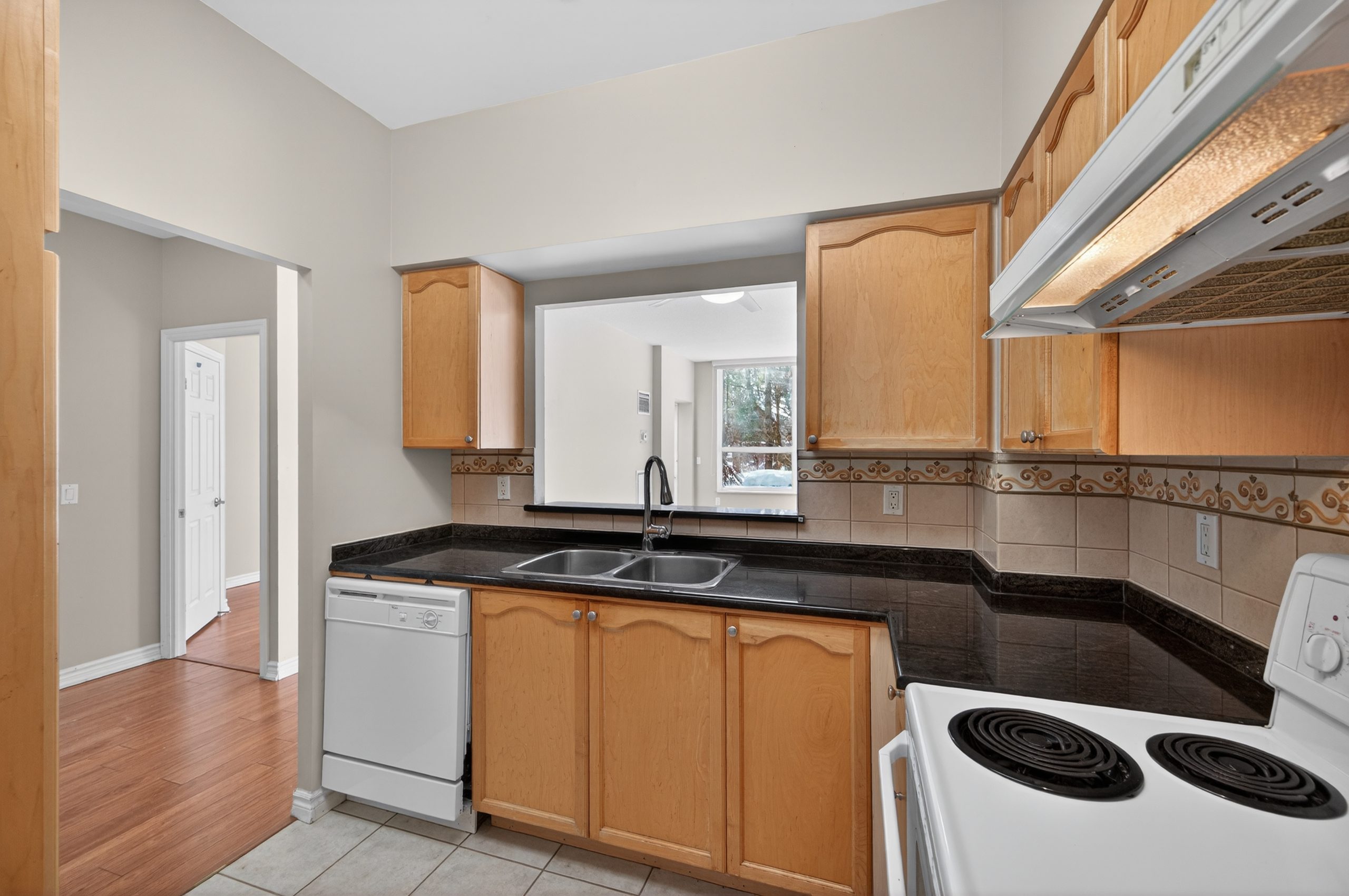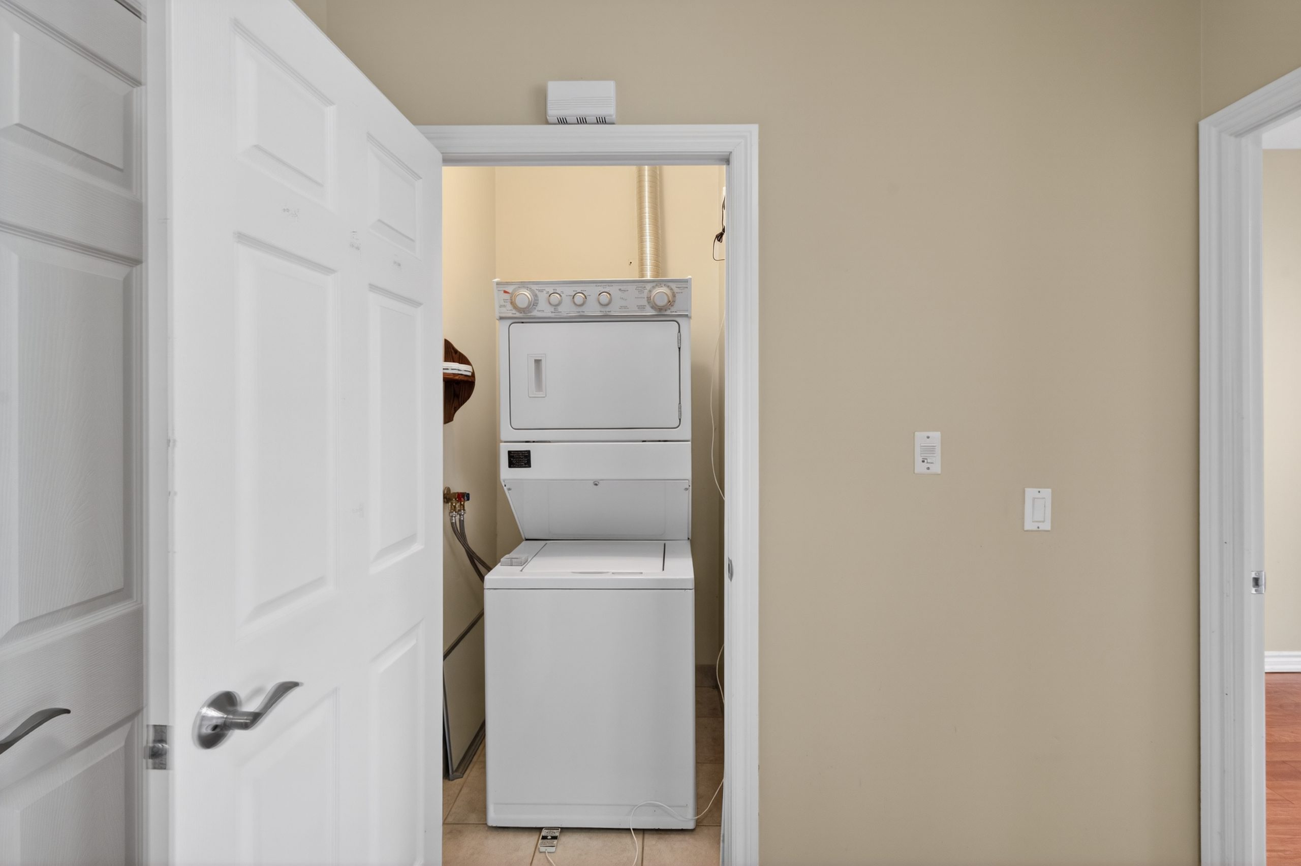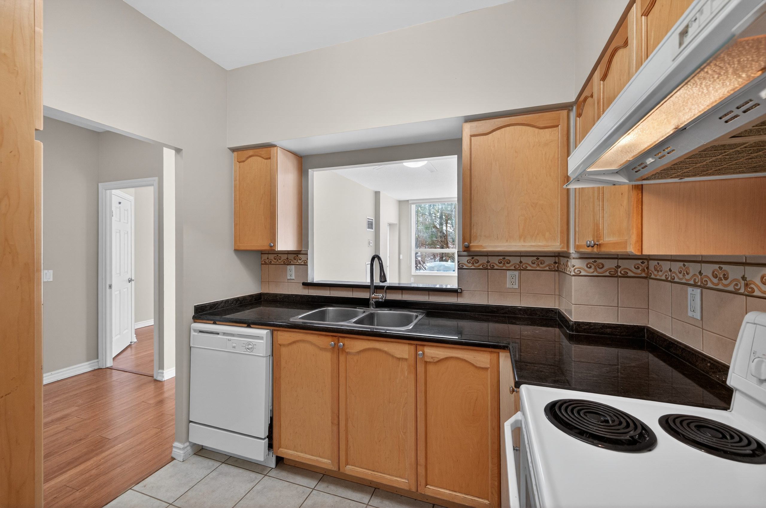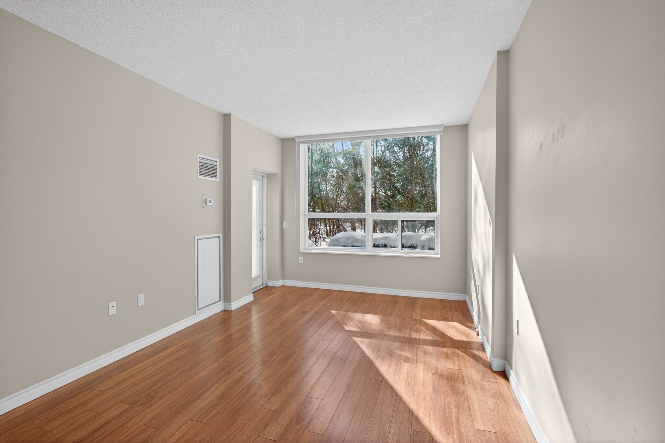 Welcome to this bright ground-floor 1-bedroom plus den condo at Hearthstone by the Lake, located at 100 Burloak Drive in Burlington near the border of Oakville. This well-appointed suite features 9’ ceilings, laminate flooring and ceramic tile throughout, and a convenient walk-out to a private patio. The spacious primary bedroom offers a large closet, while the den provides flexible space for an office or sitting area. The kitchen includes a pass-through to the dining area, and the 3-piece bathroom is equipped with a walk-in shower, safety grab bars, under-counter storage, and an emergency call button. In-suite laundry includes a full-size stacking washer and dryer.